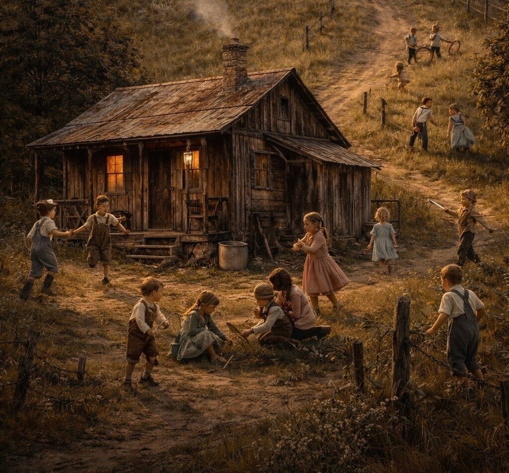 My grandmother, her parents, and their other innumerable progeny running around all lived together in a tiny shack at the bottom of a hill. At the top of this hill sat another somewhat larger and nicer shack; but a hovel nonetheless. Whether or not this home included any other children or not is not within the scope of my knowledge, being that all this took place a half century before I made my presence known on this old earth.